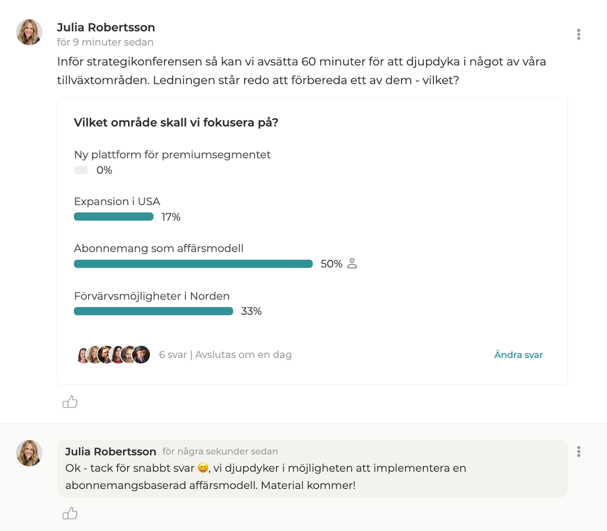Hippoly’s polling feature enables dynamic interaction within your team by facilitating the creation of questions that can range from highly structured to more open-ended responses. This tool is designed for both ease of use and adaptability. You initiate a poll through a post, and you have the autonomy to set the urgency for responses according to your needs.