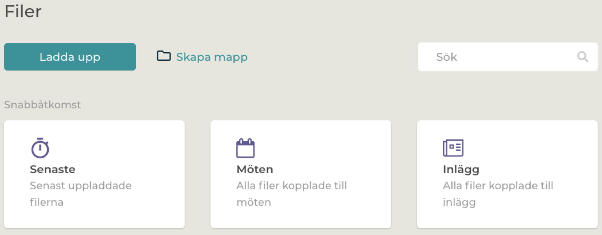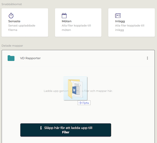 För att skapa ordning och reda bland teamets dokument kan du skapa en mappstruktur. Detta gör du under valet Filer i vänstermenyn. Du kan välja att antingen använda den färdiga mall (endast tillgänglig i samarbetsytor för styrelser) som finns för mappstruktur eller skapa en existerande struktur som du redan har på t ex din dator genom att dra hela mappen och släppa den i Hippoly.