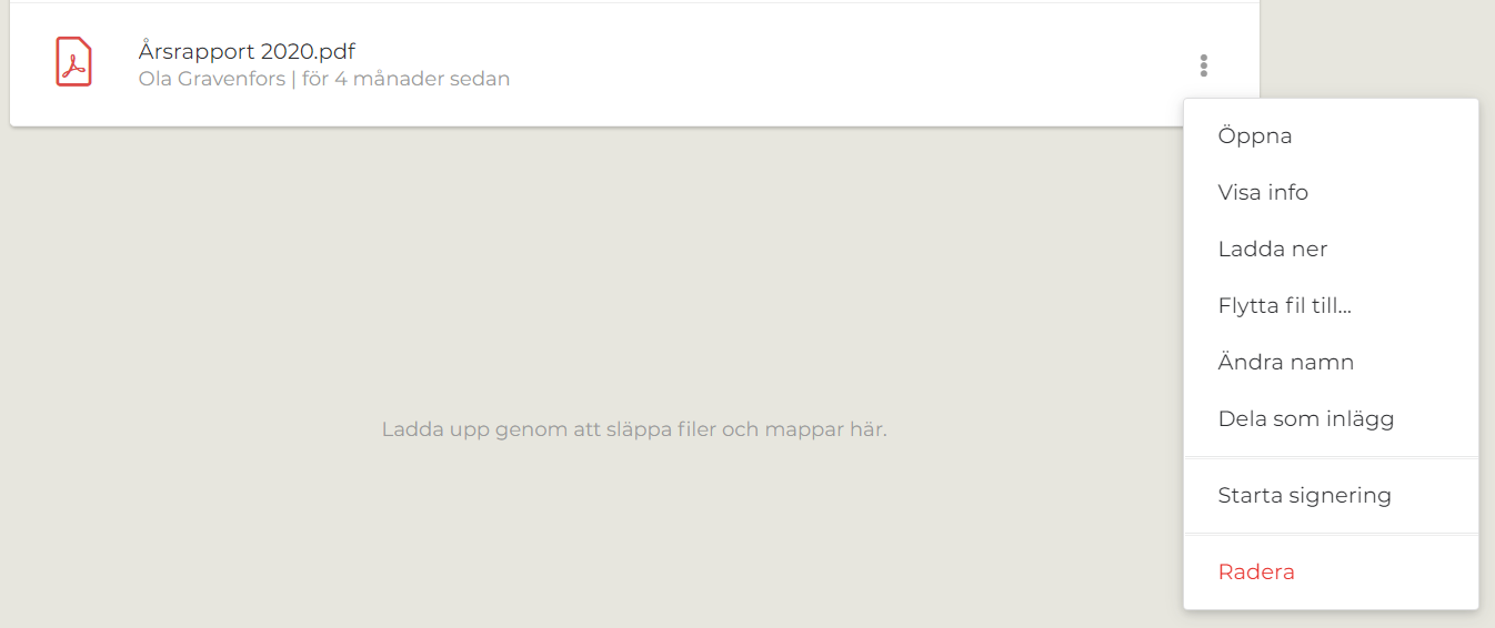 När du har laddat upp en fil i till Hippoly kan du självklart öppna filen genom att klicka på den. Det finns också ett antal andra funktioner att välja mellan och som du når genom att klicka på de tre lodräta prickarna till höger om filen.
