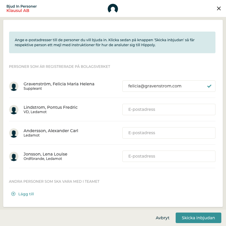 Fyll i e-postadresser till de personer du vill bjuda in och klicka sedan på Skicka inbjudningar. Hippoly skickar då automatiskt ut ett mejl till de inbjudna innehållandes instruktioner för hur de ansluter sig till samarbetsytan.