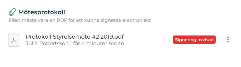 Om en person som ska signera inte vill göra det av någon anledning kan hen välja att Avvisa signeringen. Dokumentet får då statusen Signering avvisad och alla som är med i signeringsflödet blir notifierade om detta både via mejl och i Hippoly.