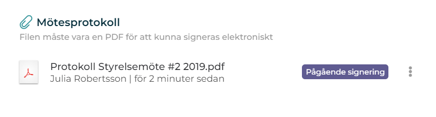 För att starta en signering av ett mötesprotokoll behöver du först ladda upp filen under fliken ”protokoll” i PDF format. Klicka sedan på starta signering.