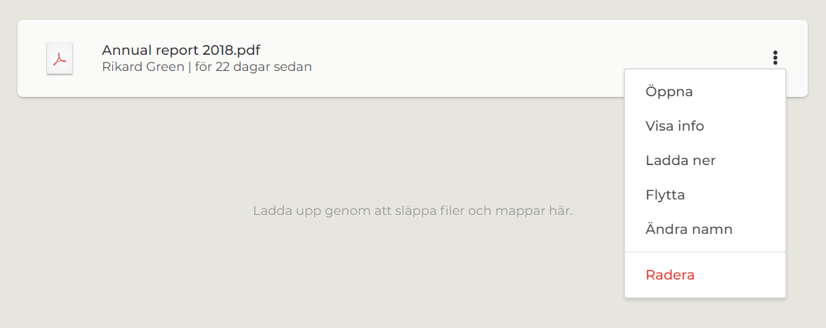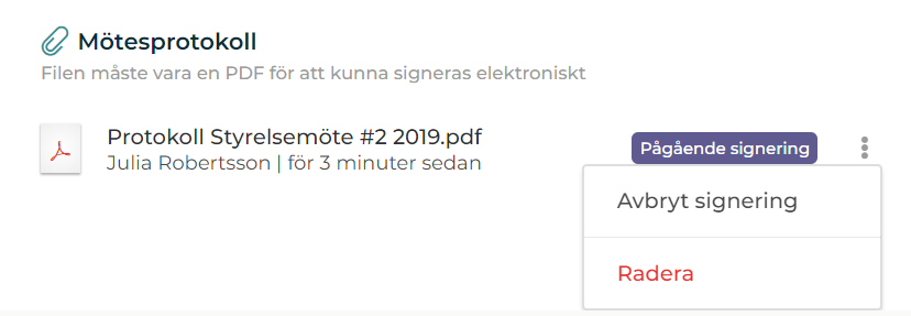 Du kan nu välja att starta signeringen igen för samma fil, eller radera filen och ladda upp en ny version av protokollet. Detta gör du via dokument-menyn som du finner om du klickar på ikonen till höger om statusen.