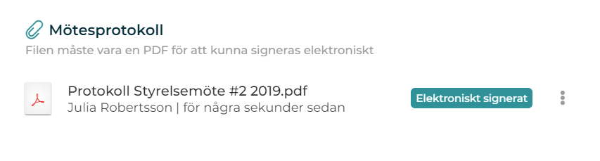 3. När alla som ska signera dokumentet har genomfört signeringen uppdateras det ursprungliga protokollet. En signerad version finns nu tillgänglig och statusen ändras till Elektroniskt signerad.