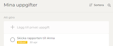 Här samlas alla dina uppgifter från samtliga samarbetsytor som du är medlem i och du har möjlighet att skapa Privata uppgifter.